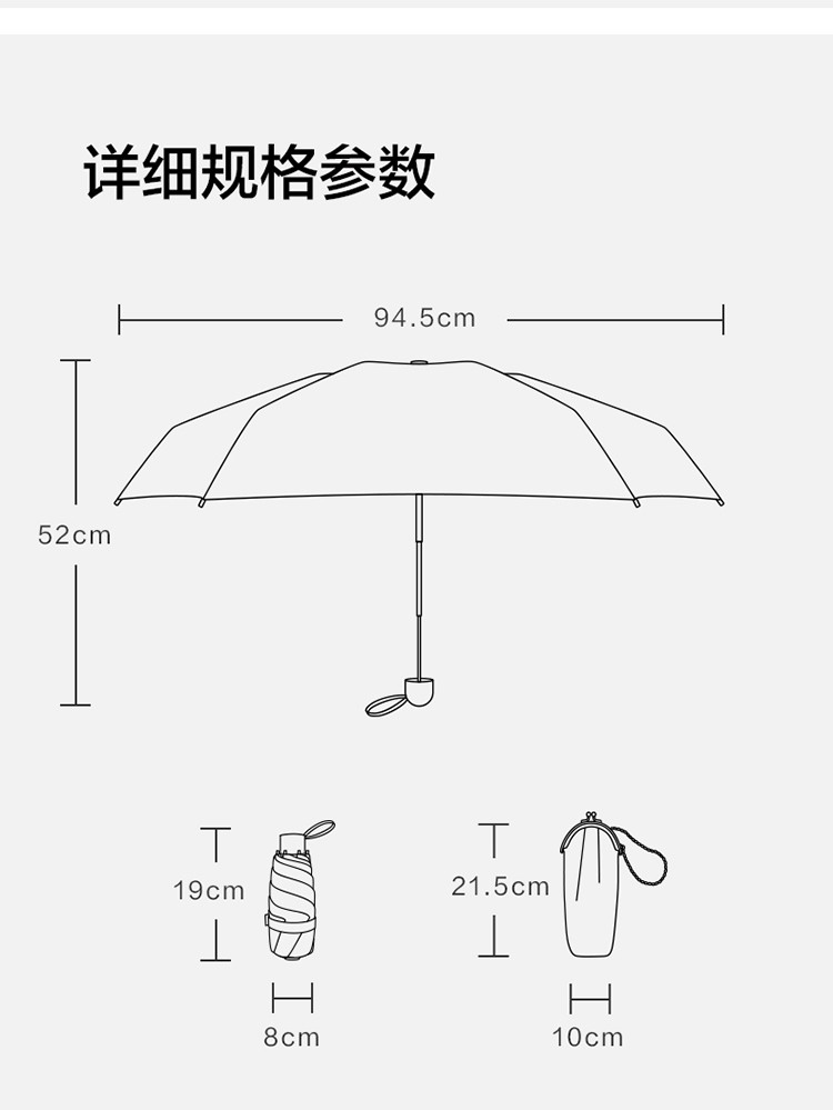 风格: 时尚 适用季节: 春,夏,秋,冬 适用人群: 成人 伞种类: 遮阳雨伞通用 伞款式: 五折伞 伞面涂层: 黑胶 表面工艺: 热压防紫外线涂层 伞布材质: 聚酯纤维 打开方式: 手动 适用性别: 女士 产地: 中国 商品配件: 晴雨伞*1 伞套*1 商品编码: 22口袋绿萦